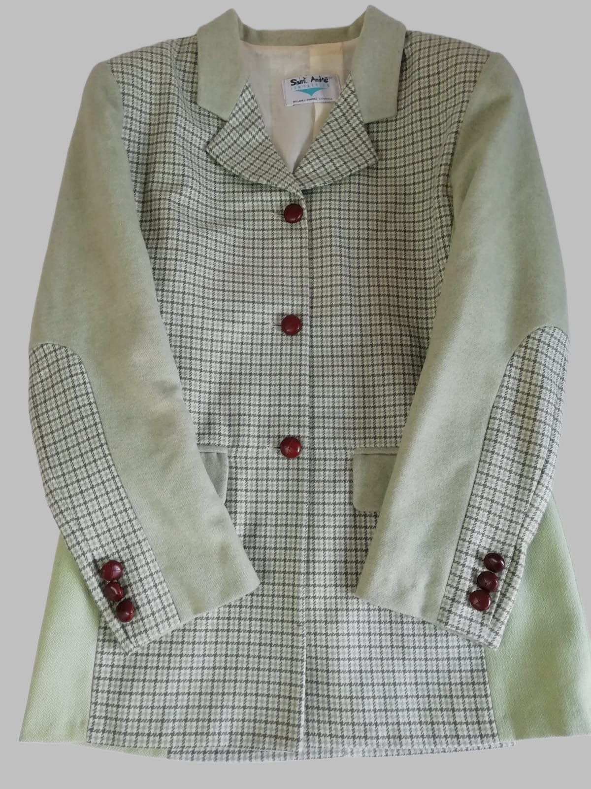 Blazer anni 70 con bottoni in cuoio in 100 % lana vergine e fodera in viscosa, taglio dritto e spalline imbottite, reverse a punta. Color verde pastello chiaro a quadri.
