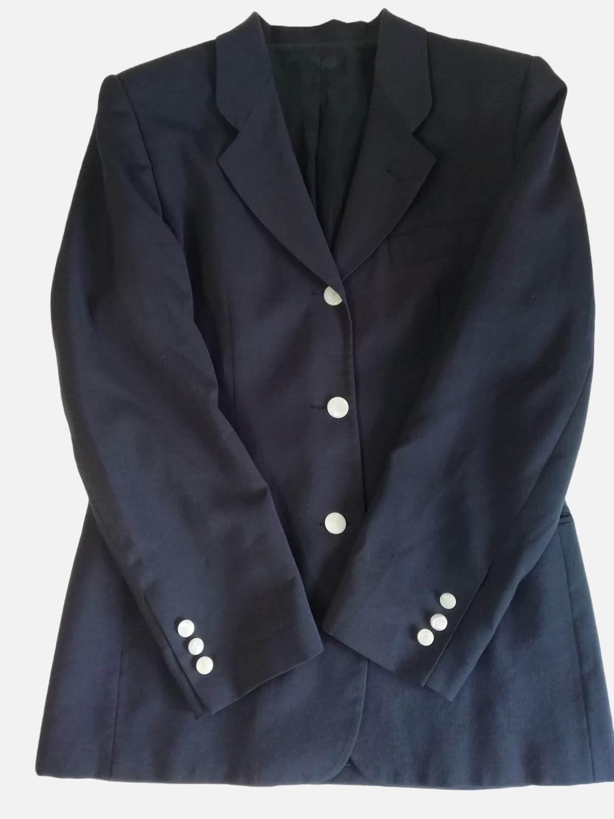 Blazer in lana vergine sottile 100 % blu notte con bottoni in madreperla con spalline imbottite.