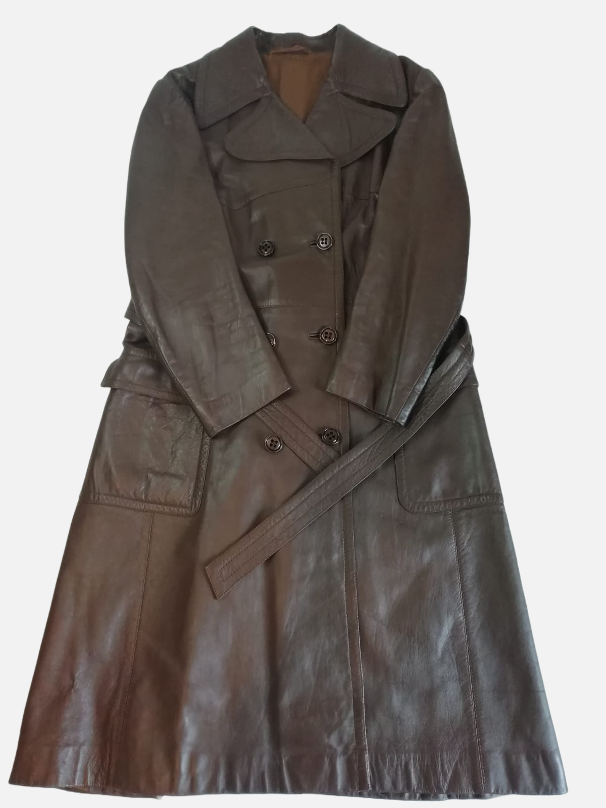 Trench coat in pelle marrone scuro con bottoni frontali e cintura lunghezza maxi.
