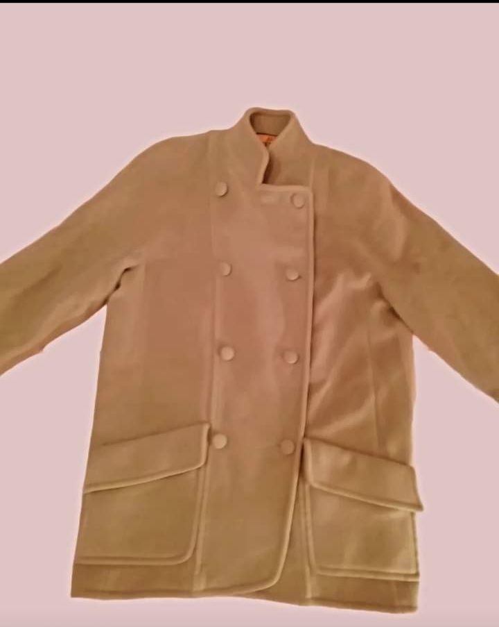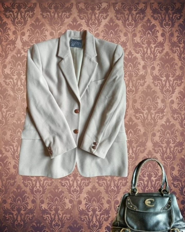 Blazer in lana e cachmere anni 70 con bottoni in cuoio taglio over, reverse a punta color beige chiaro.