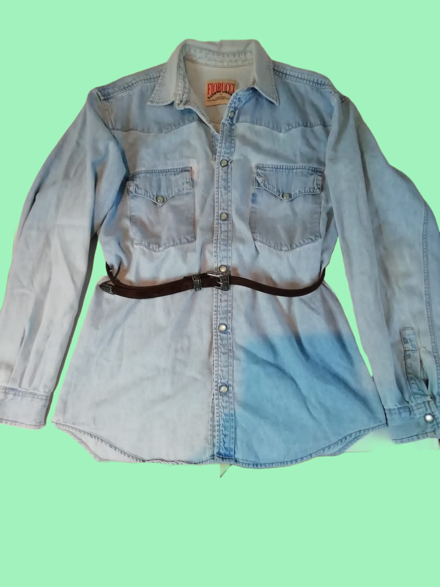 Camicia di jeans Fiorucci in lavaggio chiaro denim con chiusura bottoni automatici.
