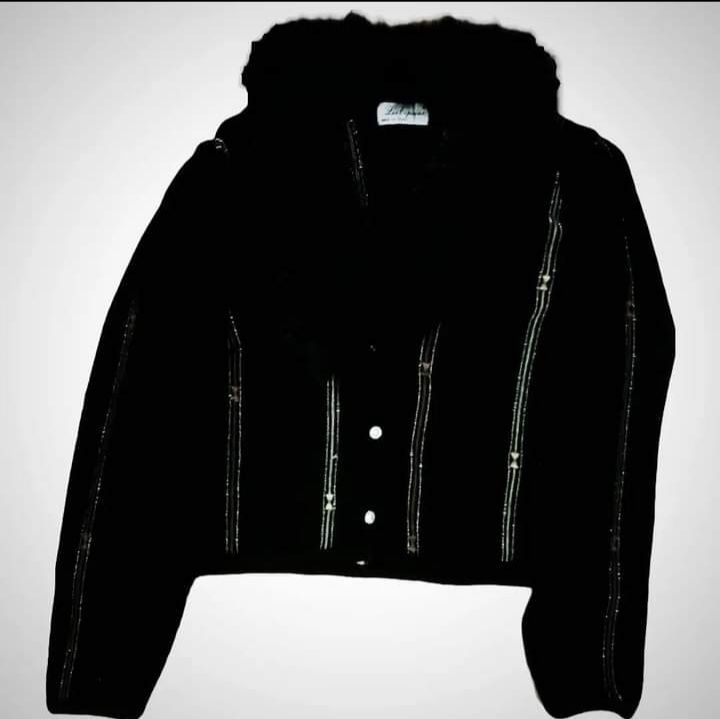 Cardigan Les Copains nero con rifiniture effetto laminato e bottoni gioiello, collo a V rivestito in eco pelliccia anni80.