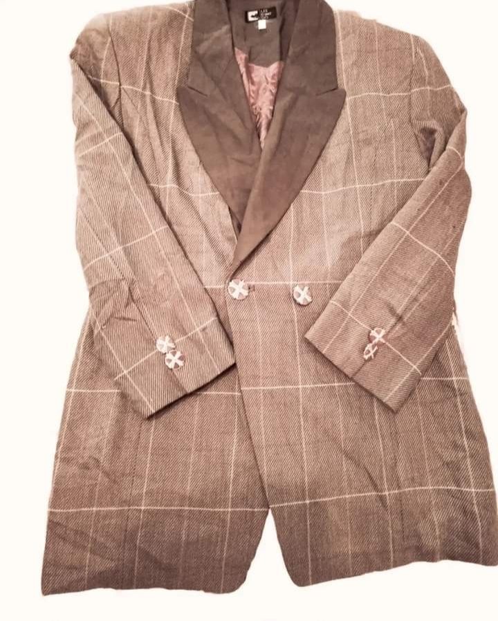 Blazer anni 80 color tortora a quadri con bottoni gioiello color vinaccia e oro, reverse a punta in marrone scuro. Vestibilità over. Taglia 42/44.