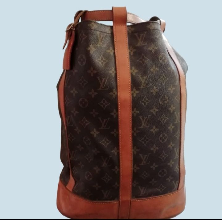 Zaino a secchiello Louis Vuitton anni 90 in tela monogram chiusura e inserti in pelle di vacchetta, chiusura a moschettone e due tracolle regolabili, scomparto unico.