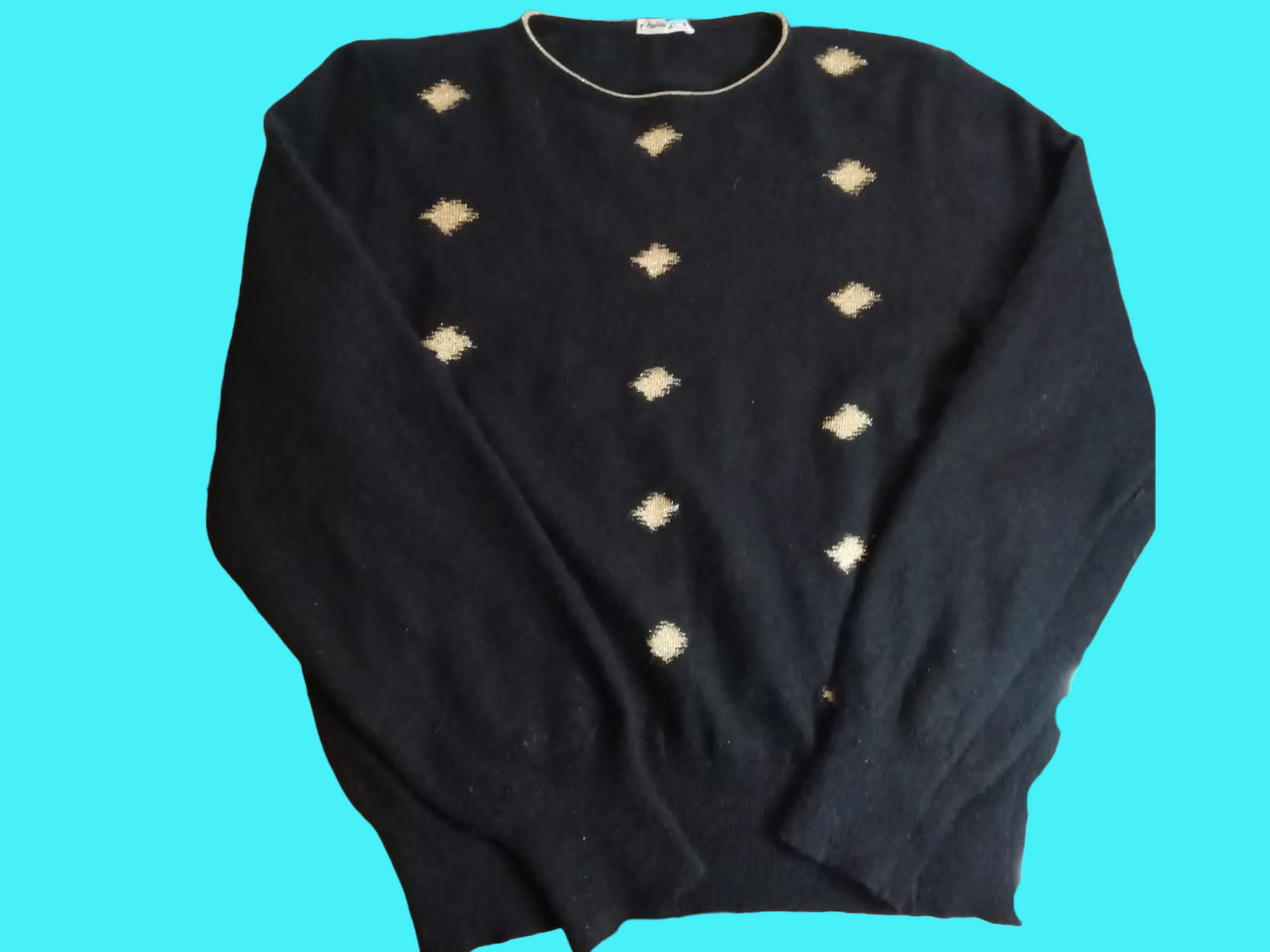 Maglioncino in cachmere vintage nero con rifiniture oro, vestibilità over sui fianchi ma aderente sulle spalle, morbido e comfortevole. Taglia M.